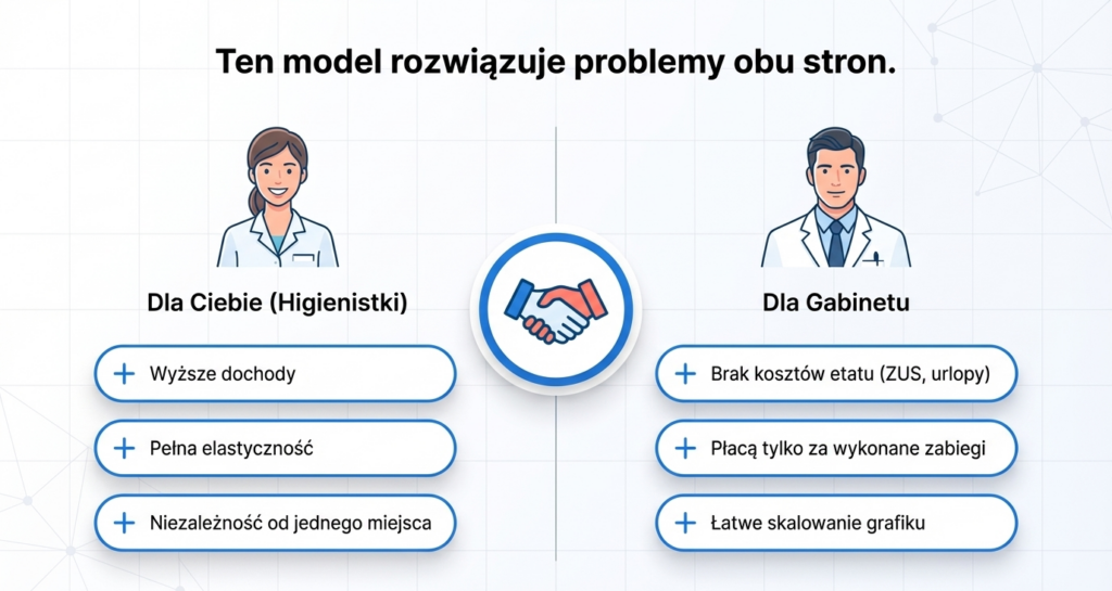 Z drugiej strony, ten model jest korzystny także dla gabinetu. Placówka płaci za realnie wykonane usługi, bez kosztów etatu i obciążeń pracowniczych. Łatwiej zarządza grafikiem i dostosowuje się do liczby pacjentów. A higienistka jako przedsiębiorca naturalnie dba o jakość pracy i obłożenie grafiku.