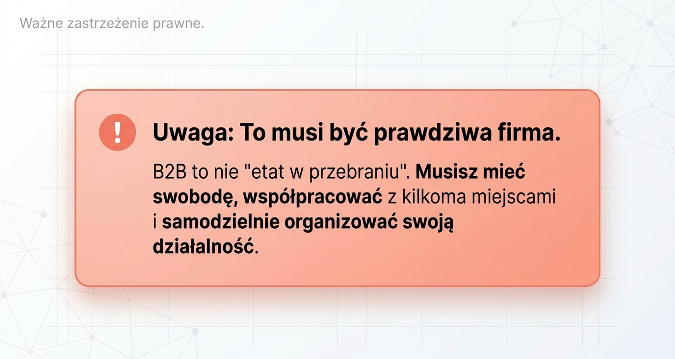 B2B daje dużą swobodę, ale tylko wtedy, gdy jest prawdziwą działalnością, a nie etatem „na papierze”. Jeśli w praktyce współpraca wygląda jak umowa o pracę, ZUS lub urząd skarbowy mogą ją zakwestionować.