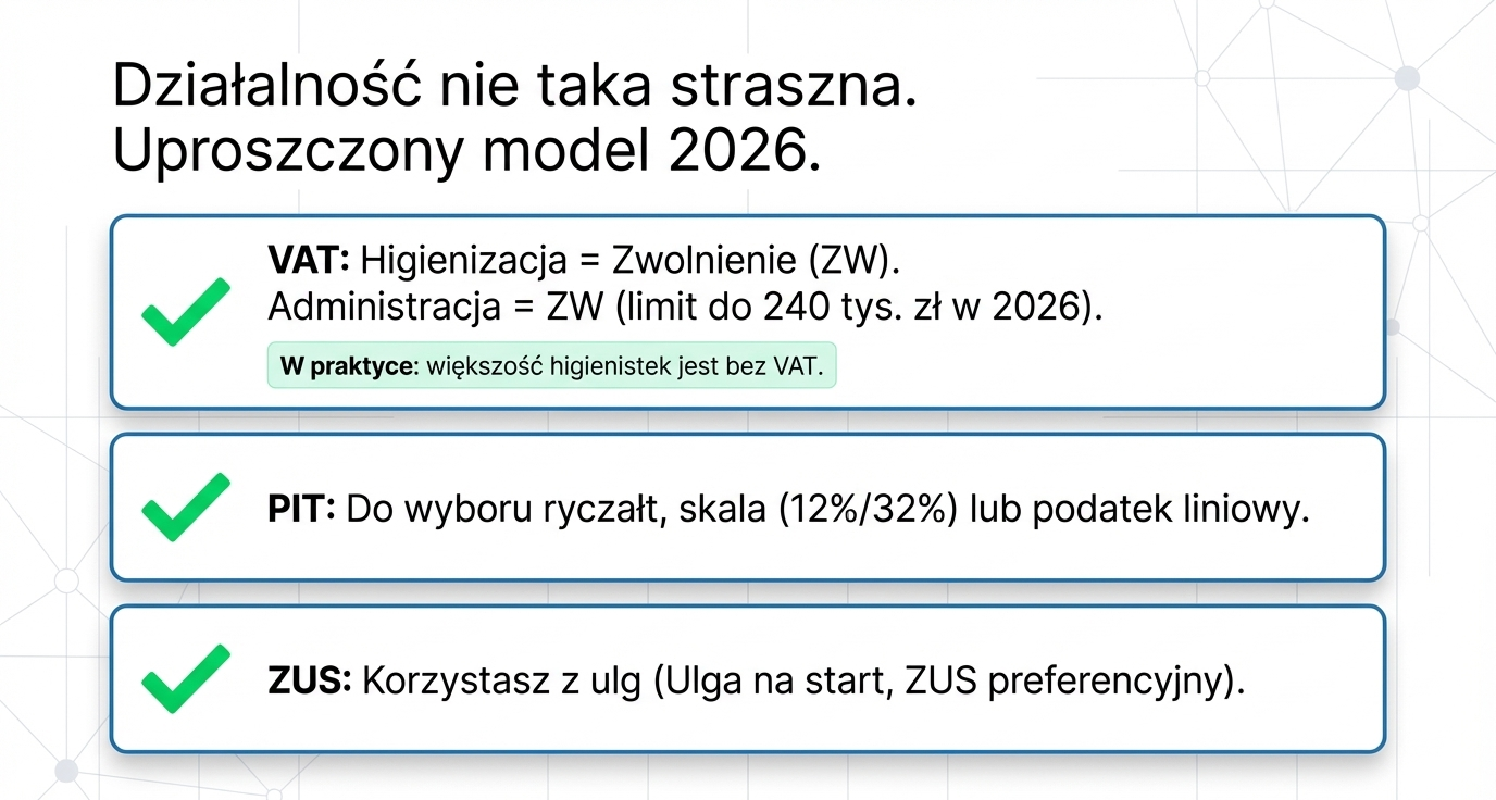 Jeśli wykonujesz również usługi administracyjne (np. obsługa grafiku, kontakt z pacjentami), to tutaj działa zwolnienie podmiotowe do limitu 240 tys. zł rocznie. Dopóki go nie przekroczysz, również możesz działać bez VAT. Dlatego w praktyce wiele higienistek na B2B funkcjonuje całkowicie poza VAT.